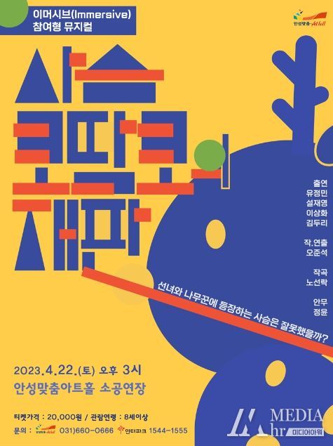 미디어아워 진금하 기자 | 안성시 안성맞춤아트홀은 오는 4월 22일(토) 15시 안성맞춤아트홀 소공연장에서 관객이 배심원이 되어 참여하는 이머시브 공연 '사슴 코딱코의 재판'을 선보인다.