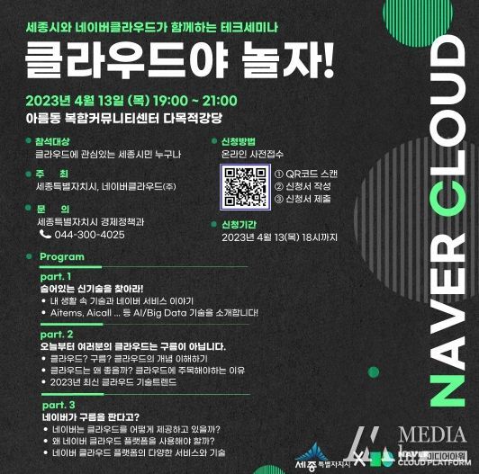 미디어아워 진금하 기자 | 세종특별자치시가 네이버클라우드와 인터넷 자원 공유(클라우드)에 관심 있는 세종시민을 위해 4월 13일 19시 아름동 복합커뮤니티센터 다목적강당에서 ‘클라우드야 놀자’를 연다.