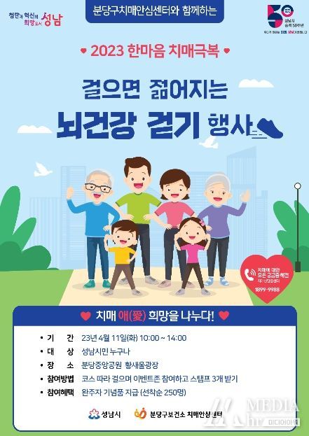 미디어아워 진금하 기자 | 성남시는 오는 4월 11일 오전 10시부터 오후 2시까지 분당 중앙공원에서 ‘한마음 치매 극복, 걸으면 젊어지는 뇌 건강 걷기’ 행사를 연다.