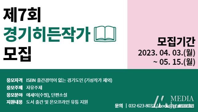 미디어아워 박미영 기자 | 경기도와 경기콘텐츠진흥원이 책 출간 경력이 없는 경기도민을 대상으로 출간 작업과 마케팅, 글쓰기 교육까지 지원하는 ‘제7회 경기히든작가’ 공모전을 개최한다.