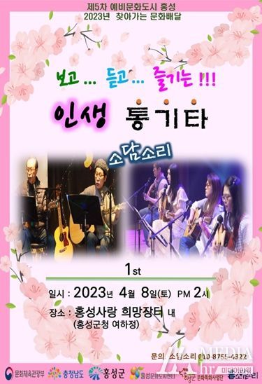 미디어아워 이호민 기자 | 홍성군 문화특화사업단'2023년 찾아가는 문화배달'사업에 선정된 소담소리의‘보고 듣고 즐기는 인생 통기타’공연이 오는 4월 8일 오후 2시부터 홍성사랑 희망장터가 열리는 여하정 상설무대에서 개최된다.