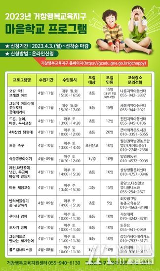 미디어아워 이호민 기자 | 거창군은 3일부터 거창행복지구 마을학교 프로그램에 참가할 관내 초·중·고 학생 152명을 선착순 모집한다.