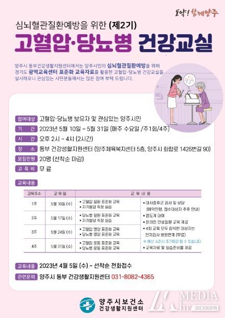 미디어아워 진금하 기자 | 양주시보건소 동부 건강생활지원센터는 양주시민의 심뇌혈관질환 예방을 위해 만성질환 보유자 및 교육에 관심이 있는 시민을 대상으로 ‘고혈압·당뇨병 건강교실’을 운영한다.