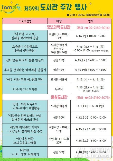 미디어아워 진금하 기자 | 과천시정보과학도서관과 문원도서관은 제59회 도서관 주간(4월 12~18일)을 맞아, ‘경계 없이 비추는 문화의 빛, 도서관’이라는 주제에 맞춰 다양한 독서문화 행사를 개최한다고 3일 밝혔다.