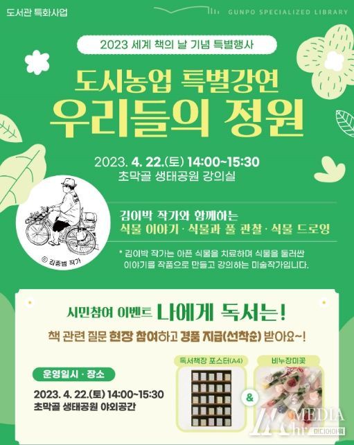 미디어아워 진금하 기자 | 군포시 특화사업과에서는 도서관 특화사업의 일환으로 ‘세계 책의 날’을 기념하는 특별행사를 마련했다. 4월 22일 초막골 생태공원에서 개최되는 이번 행사는 특별강연과 시민참여 이벤트로 운영된다.