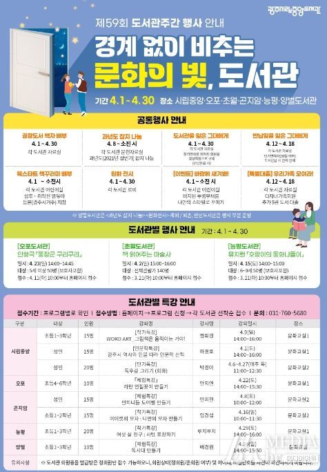 미디어아워 진금하 기자 | 광주시립중앙도서관은 4월 ‘제59회 도서관 주간 및 4월 12일 도서관의 날’을 맞아 '경계 없이 비추는 문화의 빛, 도서관'을 주제로 다양한 독서문화행사를 펼칠 예정이다.