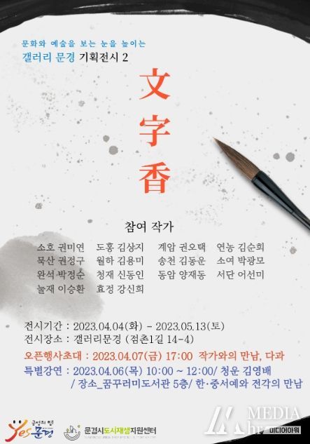 미디어아워 진금하 기자 | 문경시도시재생지원센터의 두 번째 기획전시 ‘문자향’이 4월 4일(화)부터 4월 15일(토)까지 갤러리 문경에서 열린다. 일요일, 월요일 휴관을 제외하고 12시부터 17시까지 관람을 할 수 있다. 이번 전시는 14명의 작가가 참여해 한글서예, 한글 캘리그라피와 한문 서예의 다양한 서체를 활용한 작품 30여 작품이 선보인다.