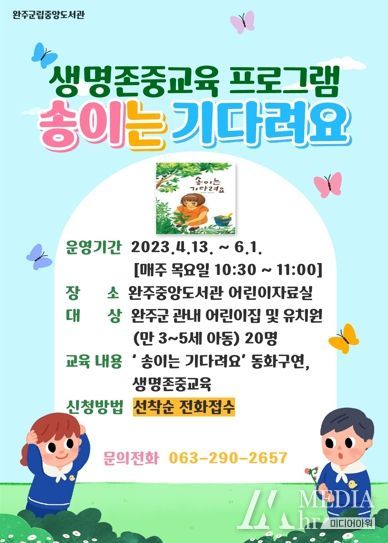 오는 13일부터 완주군 어린이(만3~5세) 20명을 대상으로 어린이자료실에서 매주 목요일 오전 10시부터 30분 동안 진행되며, 프로그램 참여는 전화 로 접수하면 된다.