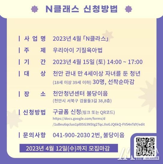 미디어아워 이호민 기자 | 천안시가 천안청년센터 불당이음의 N클래스 ‘우리아이 기질육아법’ 강의에 참여할 4세 이상의 자녀를 둔 청년(18~39세) 부모를 모집한다고 5일 밝혔다.