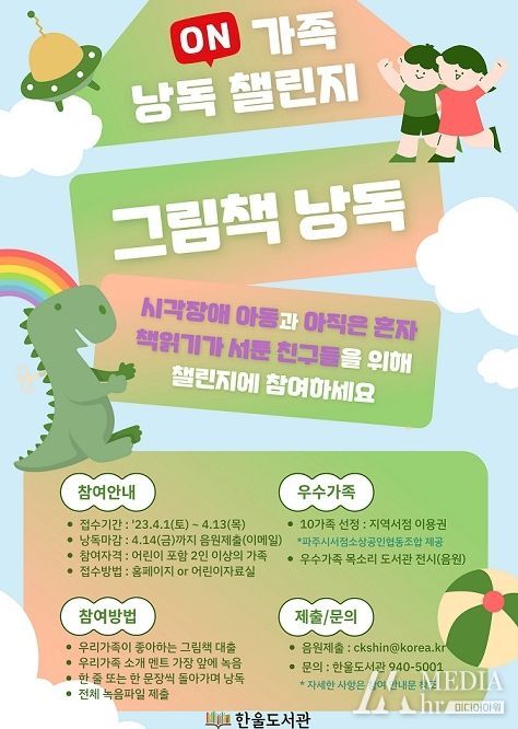 미디어아워 진금하 기자 | 파주 한울도서관은 4월 20일 장애인의 날을 맞아 시각장애 아동을 위한 낭독 프로그램 ‘ON(온)가족 낭독챌린지’를 운영한다고 밝혔다.