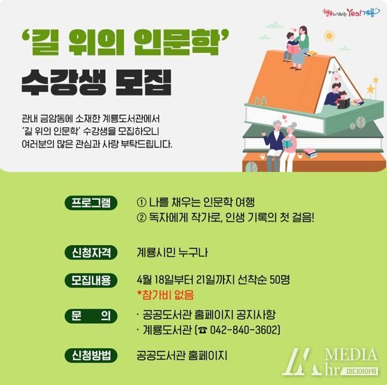미디어아워 이호민 기자 | 계룡시는 관내 금암동에 소재한 계룡도서관에서 ‘길 위의 인문학’ 수강생을 모집한다고 밝혔다.