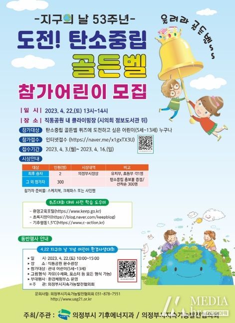 미디어아워 진금하 기자 | 의정부시는 4월 22일(토) 지구의 날 53주년을 기념해 ‘도전! 탄소중립 골든벨’ 퀴즈대회를 개최한다. 직동공원 내 암벽등반장(클라이밍장)에서 5세~13세 어린이 대상으로 1시간가량 진행될 예정이다.