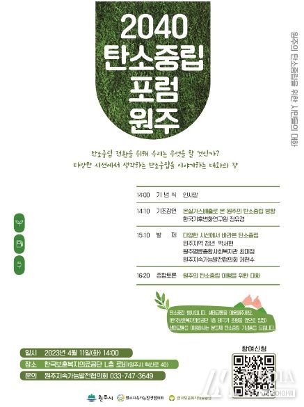 미디어아워 진금하 기자 | 제15회 기후변화주간을 맞아 원주시민과 함께하는 '2040 탄소중립포럼 원주'가 11일 오후 2시 한국보훈복지의료공단 L층 로비에서 열린다.