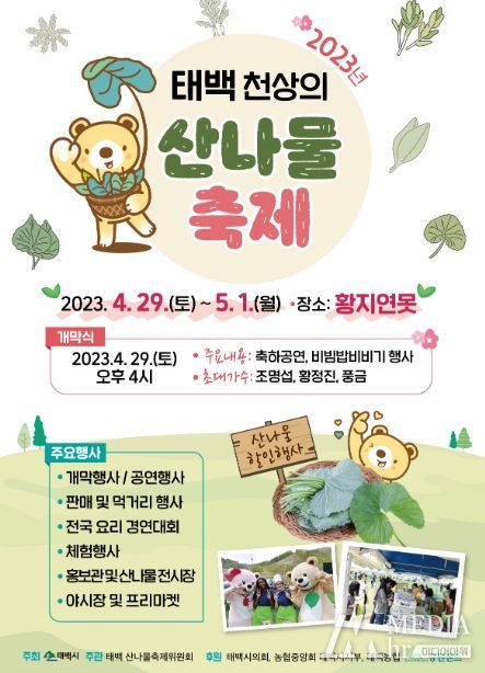 미디어아워 진금하 기자 | 태백시는 산나물 제철을 맞이해 오는 4월 29일부터 5월 1일까지 3일간 황지연못 및 태백문화광장 일원에서 2023년 태백 천상의 산나물 축제를 개최한다.