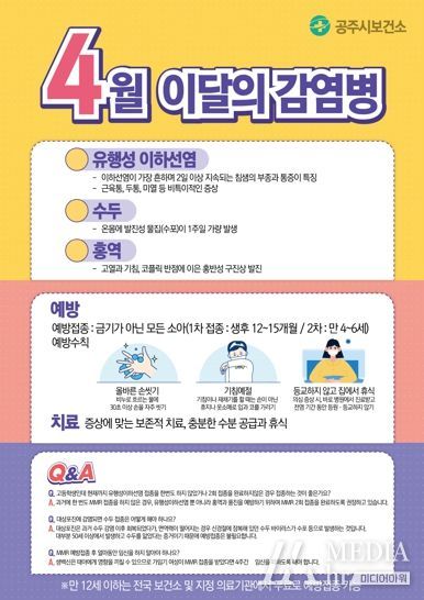 미디어아워 이호민 기자 | 공주시는 코로나19 장기화로 감염병에 대한 시민들의 관심이 높아지고 선제적 예방관리가 중요해짐에 따라 ‘이달의 감염병 바로 알기 사업’을 실시하기로 했다고 7일 밝혔다.