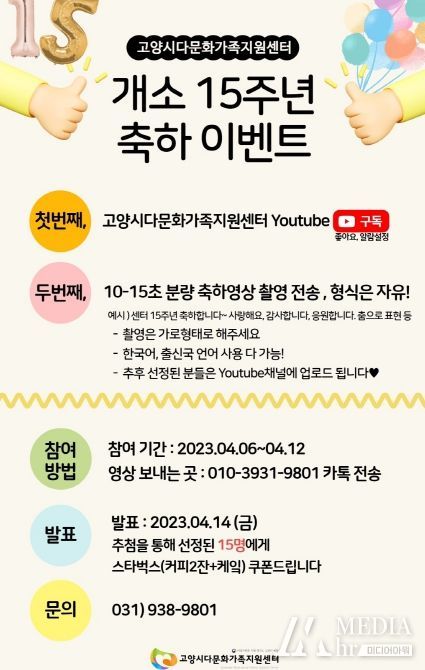 미디어아워 진금하 기자 | 고양시다문화가족지원센터가 올해로 15주년을 맞는다. 센터는 4월 15일 개관기념일을 앞두고 회원들과 지역주민을 대상으로 온라인 이벤트를 진행한다.