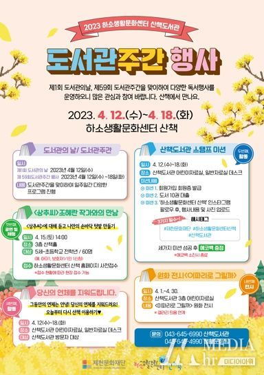 미디어아워 이호민 기자 | 제천문화재단은 오는 12일부터 18일까지 ‘제1회 도서관의 날’과 ‘제59회 도서관 주간’을 맞아 하소생활문화센터 산책에서 시민들을 위해 다채로운 프로그램을 진행한다.