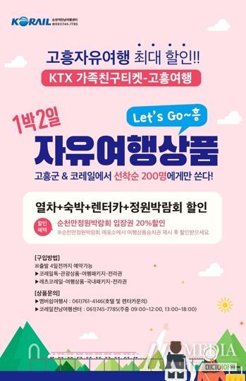 미디어아워 이호민 기자 | 고흥군이 코레일 광주전남본부와 협업해 1박 2일 자유여행상품인 ‘Let`s Go~흥 1박2일 자유여행’을 최대할인가로 선보인다.