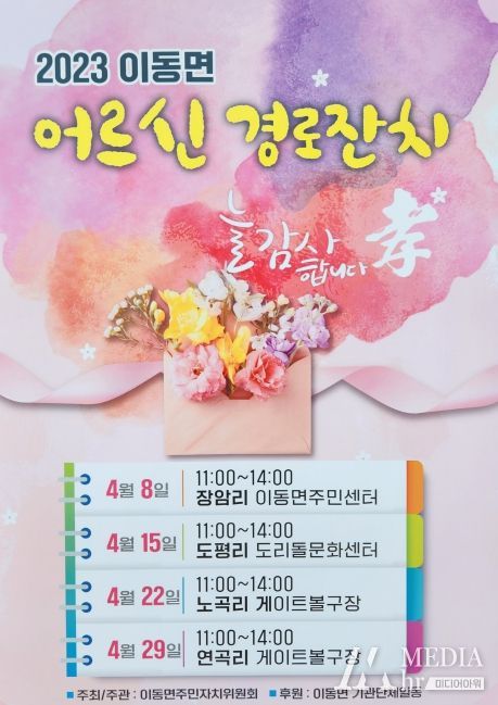 미디어아워 진금하 기자 | 이동면 주민자치위원회는 지난 4월 8일을 시작으로 이달 말일까지 매주 토요일마다 관내 65세 이상 어르신들을 대상으로 ’어르신 경로잔치‘를 진행한다.