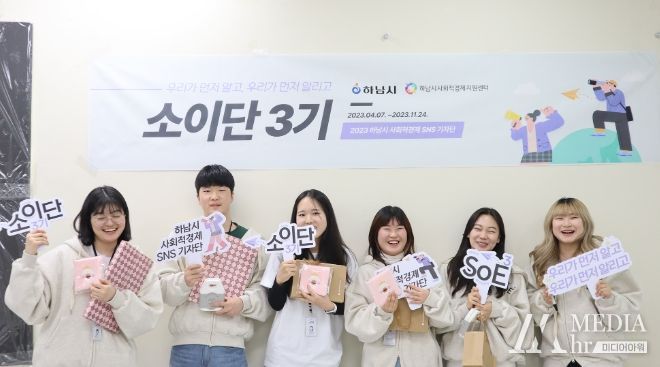 미디어아워 진금하 기자 | 하남시사회적경제지원센터가 지난 4월 7일(금), 최유진 하남시사회적경제지원센터 센터장과 하남시사회적기업협의회 회장 김은순((주)나누리 대표), 송정희 부회장((주)이안디자인 대표), 김성환 이사(사람과안전(주)) 및 소이단 3기 단원 등이 참석한 가운데 하남시 사회적경제 SNS 기자단 “소이단 3기” 발대식을 진행했다.