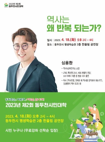 미디어아워 진금하 기자 | 동두천시는 오는 4월 18일 오후 2시 동두천시 평생학습관에서 심용환 역사N교육연구소 소장을 초청해 “역사는 왜 반복되는가?”라는 주제로 제2회 동두천시민대학 강좌를 개최한다.