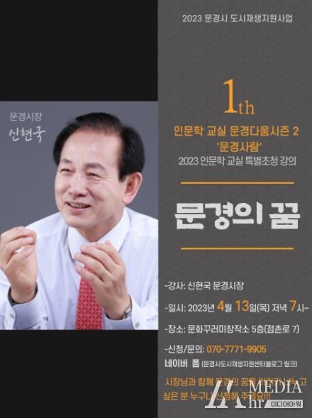 미디어아워 진금하 기자 | 문경시 도시재생지원센터는 4월 13일(목) 저녁 7시 문화꾸러미창작소 5층에서 신현국 시장님을 모시고 ‘문경의 꿈’이라는 주제로 인문학 교실 문경다움 시즌2를 진행한다.