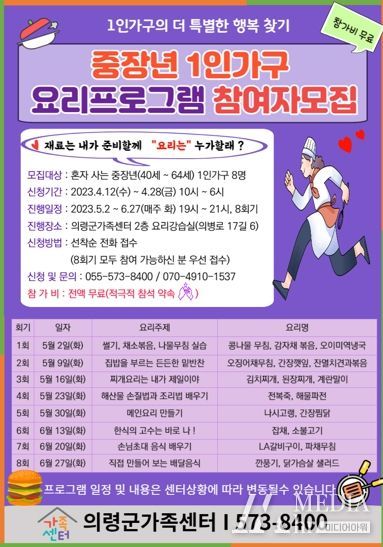 미디어아워 이호민 기자 | 의령군가족센터는 5월 2일부터 6월 27일까지 매주 화요일 총 8회에 걸쳐 중장년(40~64세) 1인가구 요리교실 프로그램 참여자 8명을 모집한다고 밝혔다.