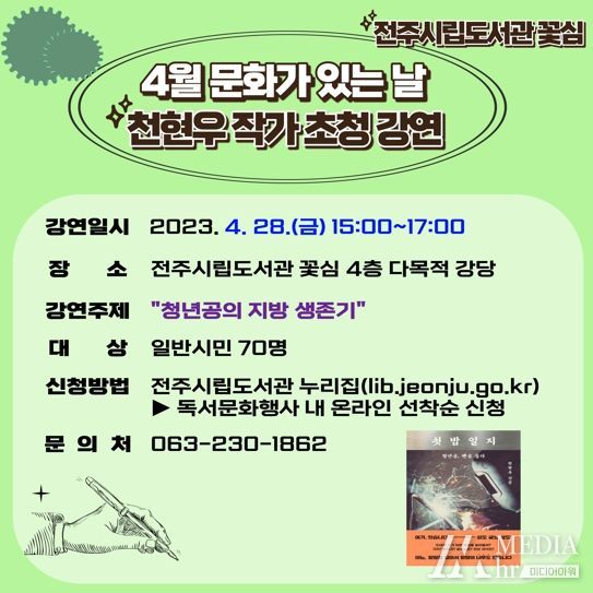 미디어아워 이호민 기자 | 전주시는 오는 28일 오후 3시 전주시립도서관 ‘꽃심’ 에서 ‘4월 문화가 있는 날 프로그램’의 일환으로 천현우 작가 초청 강연을 개최한다.