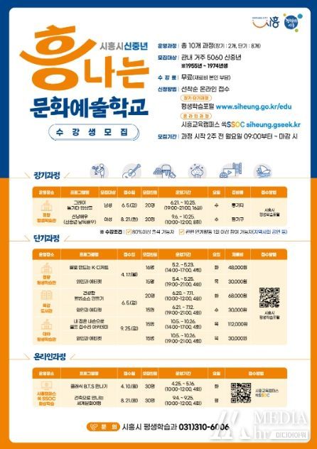 미디어아워 진금하 기자 | 시흥시는 5060 신중년(1955년부터 1974년 출생의 베이비부머세대)을 위한 실용교양과정인 ‘흥나는 문화예술학교’를 운영한다.