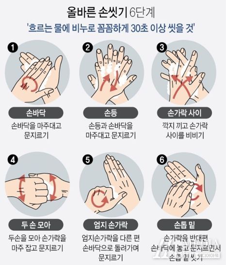 감염병 예방을 위해 권장하는 올바른 손 씻기의 방법은 ‘흐르는 물에 비누로 꼼꼼하게 30초 이상 씻는 것’이며, 손 씻기 6단계는 다음과 같다.