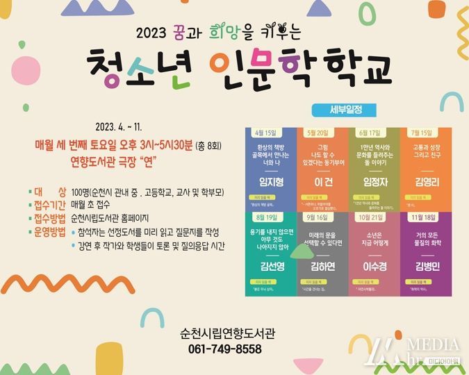 미디어아워 이호민 기자 | 순천시립연향도서관은 청소년도서 작가와 만나는 ‘청소년 인문학학교’를 운영한다고 밝혔다.
