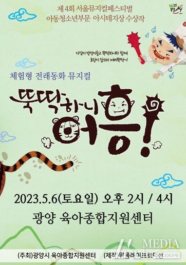 미디어아워 이호민 기자 | 광양시 육아종합지원센터는 어린이날을 맞아 오는 5월 6일 오후 2시와 4시에 센터 대강당에서 육아종합지원센터 회원을 대상으로 가족 뮤지컬 '뚝딱하니, 어흥!'공연을 선보인다고 밝혔다.