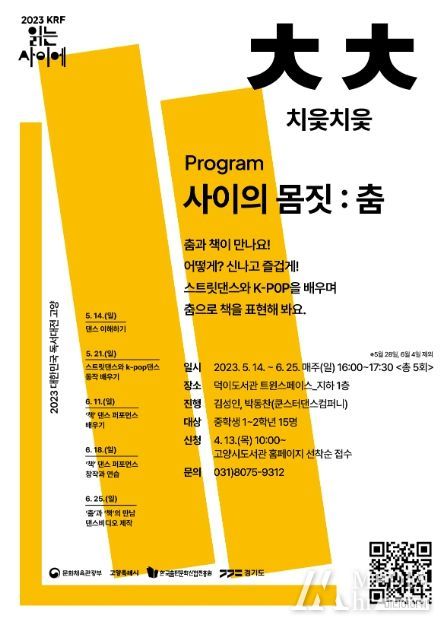참여 신청은 4월 13일 오전 10시부터 고양시 도서관센터 홈페이지를 통해 할 수 있으며, 춤에 관심 있는 중학생 1~2학년 15명을 대상으로 선착순으로 모집한다.