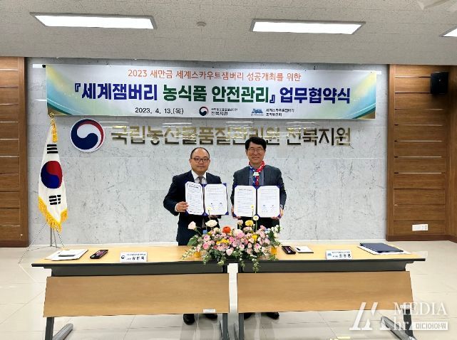 미디어아워 박미영 기자 | 2023 새만금 세계스카우트잼버리조직위원회(공동위원장 여성가족부장관 김현숙, 행정안전부 장관 직무대행 한창섭, 문화체육관광부장관 박보균, 국회의원 김윤덕, 한국스카우트연맹총재 강태선) 최창행 사무총장과 국립농산물품질관리원 전북지원) 김민욱 지원장은 13일 전북농관원 회의실에서 “2023 새만금 제25회 세계스카우트잼버리의 성공적 개최”를 위한 업무협약을 체결했다.