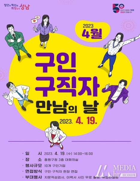 미디어아워 진금하 기자 | 성남시는 오는 4월 19일 중원구 성남동 중원구청 3층 대회의실에서 ‘4월 구인·구직자 만남의 날’ 행사를 연다.