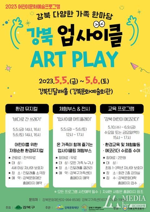미디어아워 진금하 기자 | 서울 강북구는 강북구가족센터가 강북문화재단과 협약하여 강북구 어린이와 가족을 위한 문화축제 한마당인 ‘강북 업사이클 아트플레이’를 강북문화예술회관(진달래홀)에서 오는 5월 5일부터 6월 9일까지 진행한다고 밝혔다.