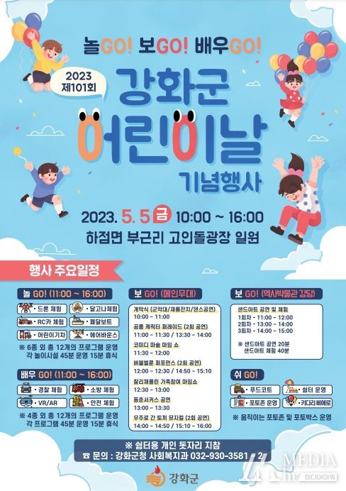 미디어아워 최지나 기자 | 강화군은 오는 5일 하점면 고인돌광장 일원에서 ‘놀GO!, 보GO!, 배우GO!’ 어린이날 기념행사를 개최한다.