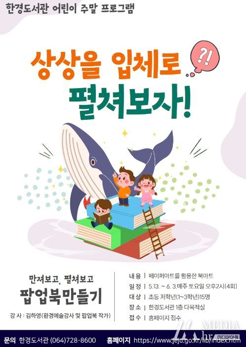 미디어아워 최지나 기자 | 제주시 한경도서관은 5월 가정의 달을 맞이하여 지역 어린이의 독서역량 강화 및 독서 습관 형성을 위하여 어린이 주말 프로그램'상상을 입체로 펼치는 팝업북 만들기'를 운영한다고 밝혔다.