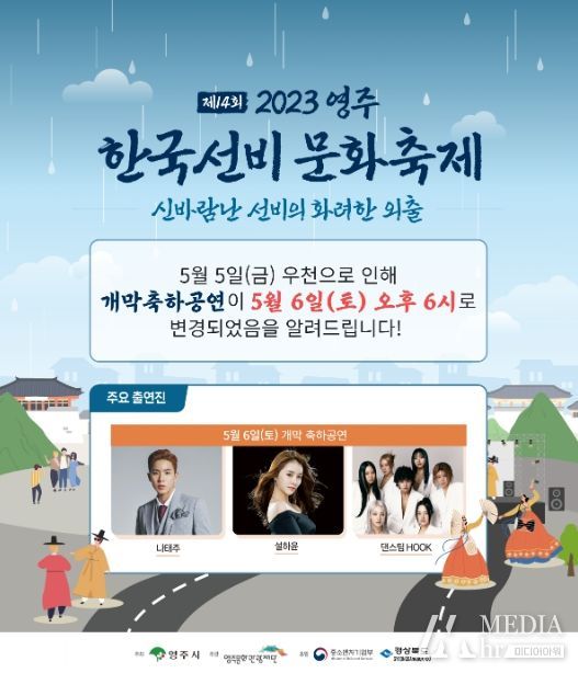 미디어아워 최지나 기자 | 영주시는 오는 5일 저녁 7시 서천 둔치 특설무대에서 개최예정인 ‘2023영주 한국선비문화축제’ 개막식이 비 예보로 6일 저녁 6시로 연기됐다고 밝혔다.