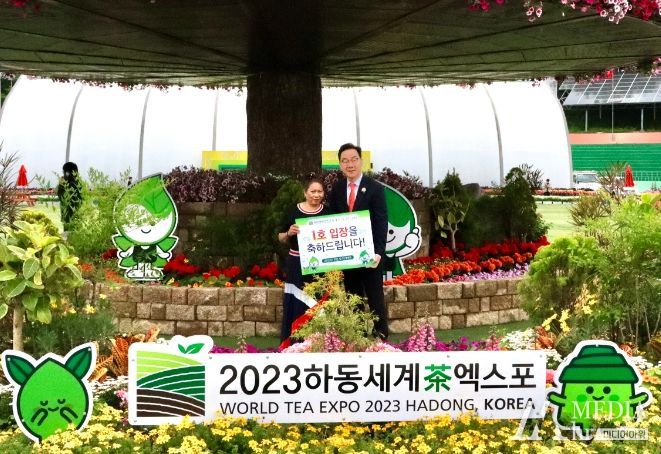 1호 입장객 박미란씨는 필리핀 국적으로 "평소 하동차에 관심이 많아 아침 일찍 엑스포장을 찾았는데 뜻밖에 1호 입장객이 되어 기쁘다"고 소감을 밝혔다.