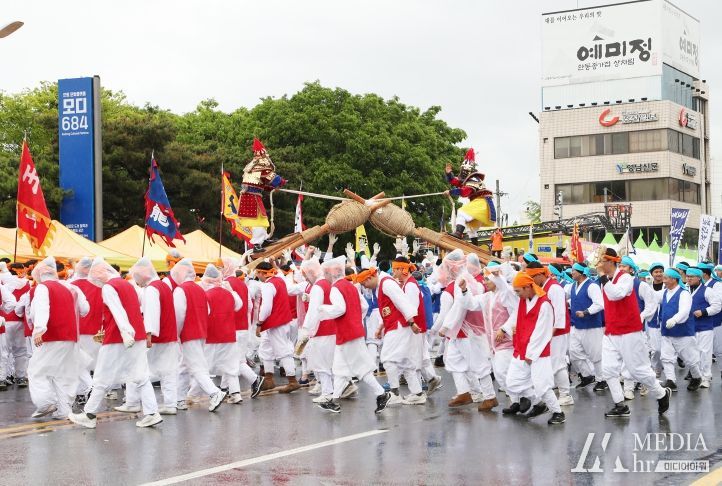 미디어아워 진금하 기자 | 제50회 차전장군 노국공주 축제 킬러콘텐츠인 안동차전놀이 공연이 6일 모디684 대로에서 시연됐다. 350명의 대규모 인원이 참여한 차전놀이 정기공연은 이번 축제의 하이라이트를 장식했다.