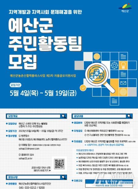미디어아워 진금하 기자 | 예산군농촌신활력플러스사업추진단은 농촌 지역개발과 지역사회 문제해결을 위한 ‘2023년 제3차 자율공모’에 참여할 단체 및 활동팀을 모집한다.