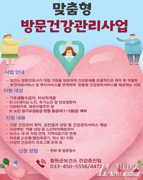미디어아워 조연정 기자 | 철원군은 보건소 방문간호사가 건강취약계층 및 저소득층을 찾아가 건강 상태를 상담하고 자가 건강관리능력을 향상시키는 대상자별‘맞춤형 방문건강관리사업’을 운영 중이다.