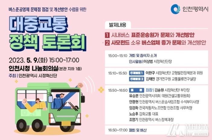 미디어아워 최지나 기자 | 인천광역시는 시정 자문기구인 인천시 시정혁신단이 9일 오후 3시, 시청 나눔회의실(본관 지하 1층)에서 ‘버스준공영제 문제점 점검 및 개선방안 의견 수렴을 위한 대중교통 정책 토론회’를 개최한다고 밝혔다.