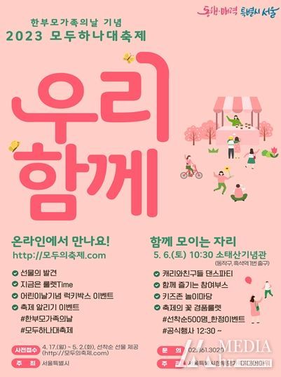 미디어아워 조연정 기자 | 서울시한부모가족지원센터는 ‘한부모가족의 날’(5.10.)을 맞아 이번주 토요일(6일) 오후 12시30분 소태산기념관(동작구 현충로75, 흑석역 1번 출구)에서'2023년 모두하나대축제' ‘우리, 함께’를 개최한다고 밝혔다.