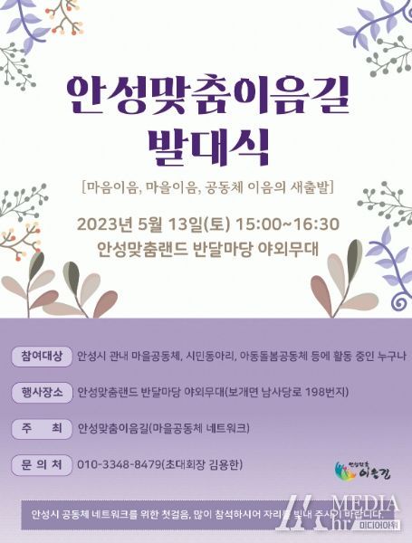 미디어아워 진금하 기자 | 공동체마을 만들기 사업에 참여했던 마을들의 모임은 ‘안성맞춤 이음길’(공동체 네트워크)이 오는 5월 13일(토) 오후 3시, 안성맞춤랜드 반달마당 야외무대(보개면 남사당로 198번지)에서 발대식을 개최한다.