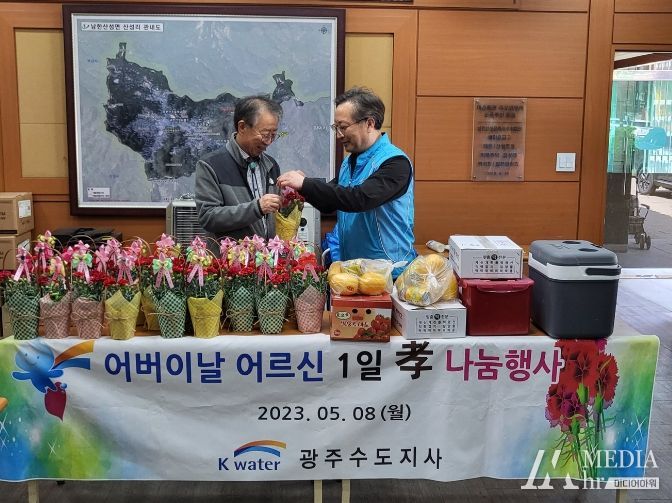 이날 K-water 직원들은 남한산성면 광지원리 마을회관과 산성리 경로당을 방문해 어르신 50명에게 150만원 상당의 카네이션과 생필품을 전달하고, 거동이 불편한 어르신들의 식사를 돕기도 했다.