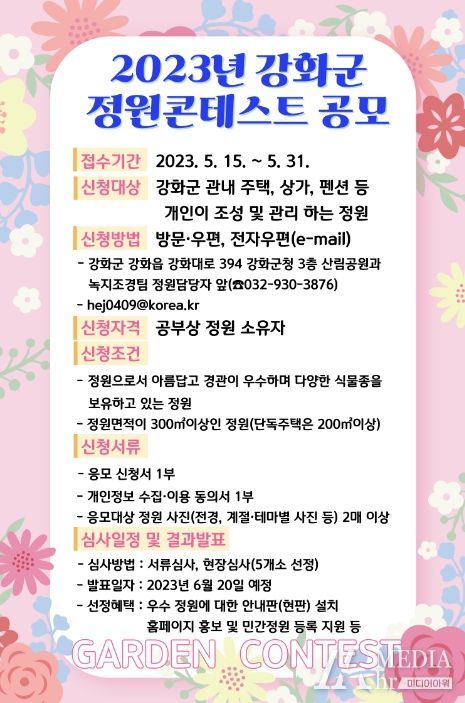 미디어아워 최지나 기자 | 강화군은 생활 속 정원 문화를 확산하고 살고 싶은 전원도시 강화를 만들기 위해 ‘2023년 정원 콘테스트’를 개최한다.