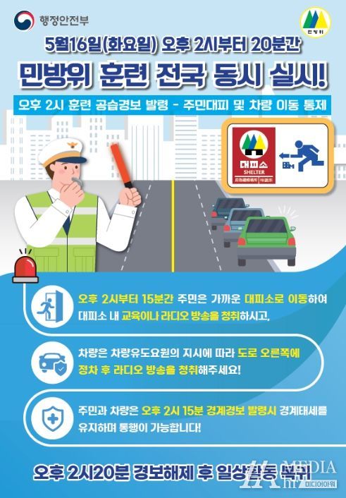 미디어아워 최지나 기자 | 제주시는 제414차‘민방위의 날’훈련이 5월 16일 오후 2시부터 20분간 행정안전부 주관으로 전국적으로 동시에 실시된다고 밝혔다.