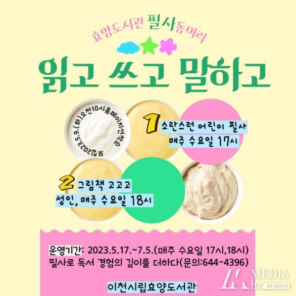 미디어아워 최지나 기자 | 이천시 효양도서관은 오는 17일부터 필사동아리 '읽고 쓰고 말하고'를 운영한다.